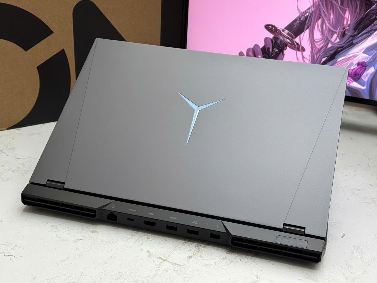 Một điểm cộng đáng chú ý khác là cổng kết nối được bố trí phía sau máy. Nguồn, HDMI, LAN hay USB đều nằm gọn gàng, giúp bàn làm việc luôn sạch sẽ, không bị vướng dây cáp khi di chuột hay sắp xếp phụ kiện. Chi tiết tưởng nhỏ nhưng lại nâng trải nghiệm sử dụng của bạn trở nên hoàn hảo, đặc biệt với những người thường xuyên chơi game hoặc làm việc lâu trên laptop.
